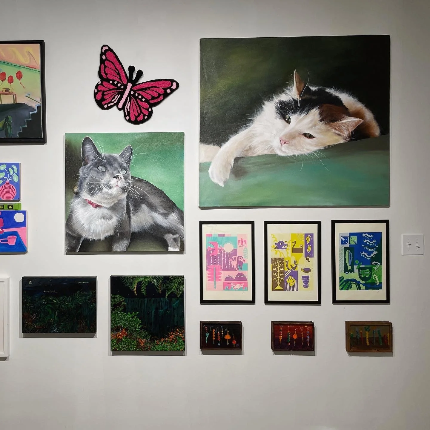 Cats can be of all kinds. For different people, cats hold a variety of emotions. In this group of paintings, these cats come from different parts of the world. They have never seen each other except through eye contact from the placement of the canvas in relation to each other